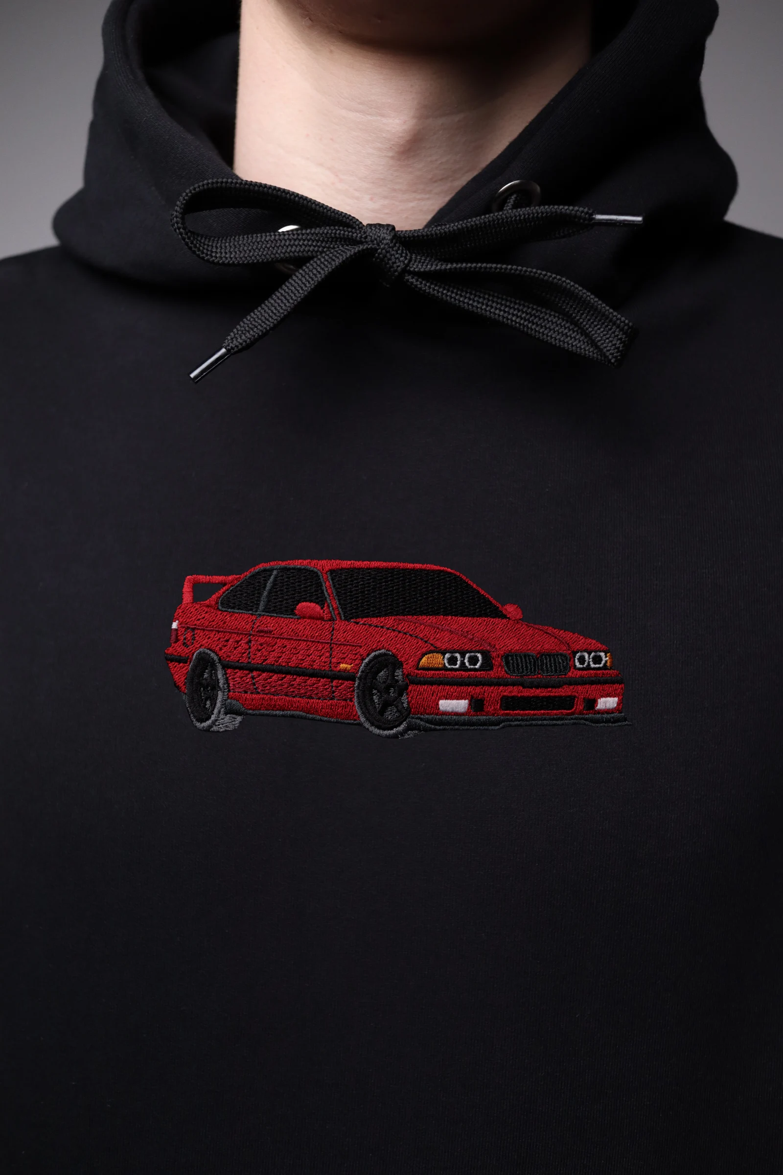 • Haft z czerwonym BMW E36 M3 na czarnej bluzie